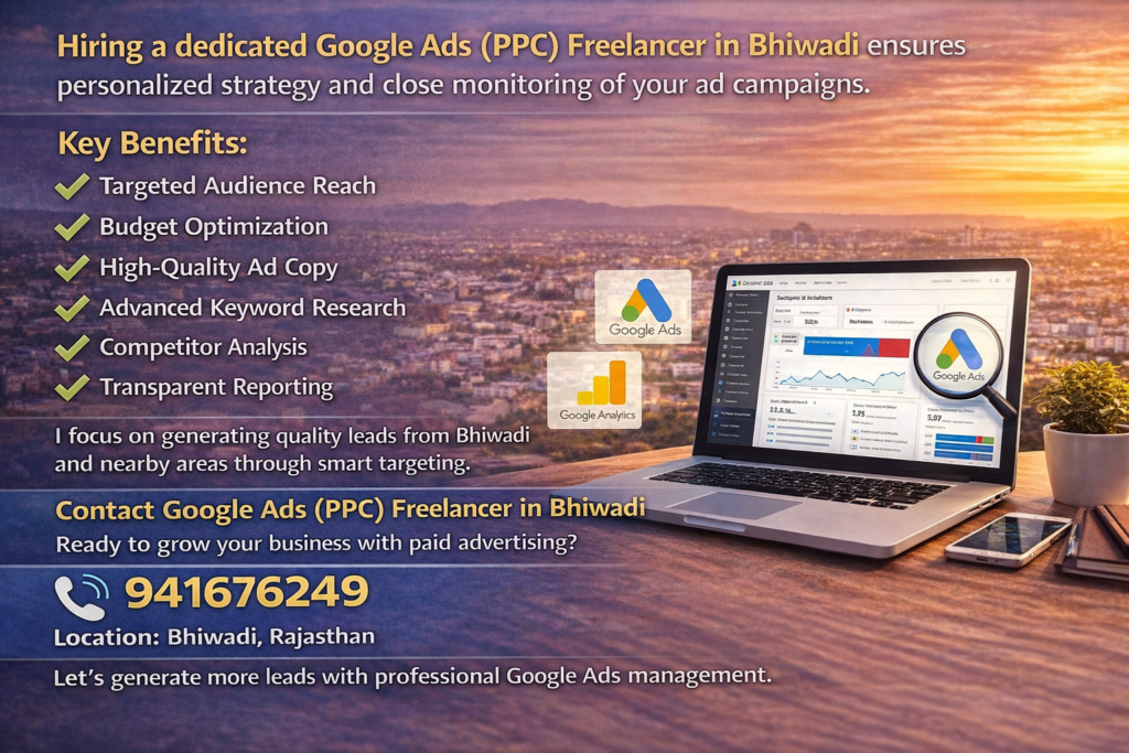 Hiring a dedicated Google Ads (PPC) Freelancer in Bhiwadi ensures personalized strategy and close monitoring of your ad campaigns.
