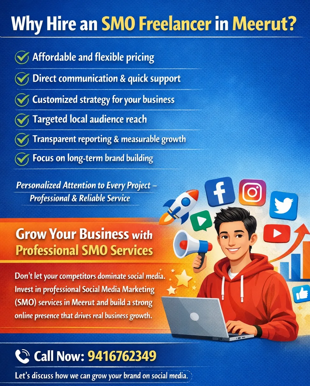 Are you looking for a professional Social Media Marketing (SMO) freelancer in Meerut to grow your business online? I provide result-oriented social media marketing services that help brands increase visibility, engagement, and leads across all major platforms.
