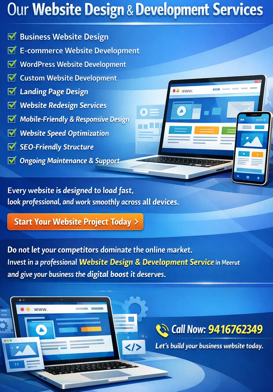 With a strong understanding of the local business market in Meerut, I create websites that are not only visually appealing but also optimized for performance and conversions. Whether you need a business website, e-commerce store, portfolio site, or landing page, I deliver customized solutions tailored to your goals.